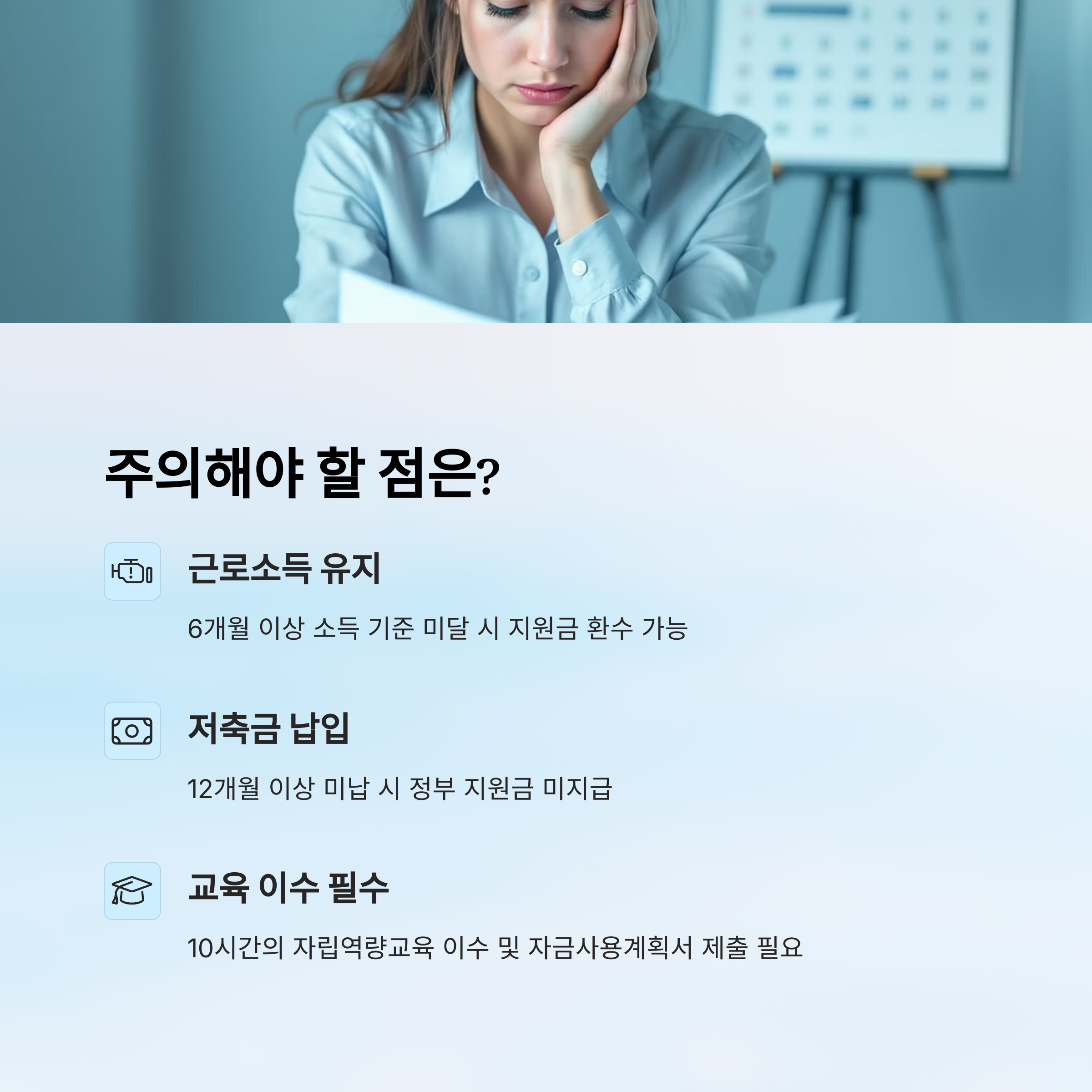 먼저 근로소득 유지가 가장 중요해요. 3년 동안 꾸준히 일하면서 월 10만 원 이상(또는 50만 원 초과~250만 원 이하)의 소득을 유지해야 해요. 중간에 일자리를 잃거나 소득이 기준 미만으로 6개월 이상 떨어지면 지원금이 사라질 수 있어요. ⚠️