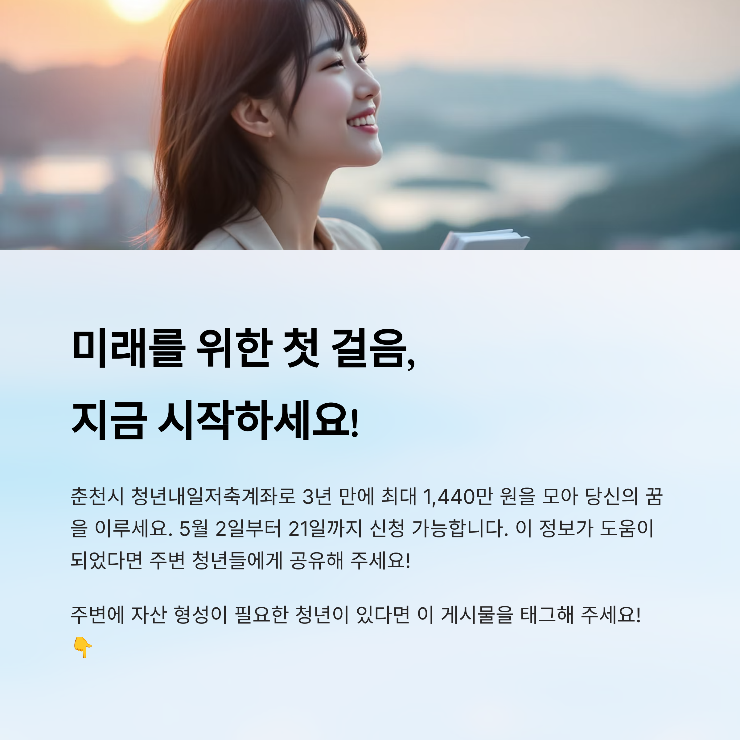 춘천시가 2025년에도 어김없이 청년들의 미래를 응원하기 위해 '청년내일저축계좌' 신규 참여자를 모집해요. 일하는 청년들이 3년 동안 자산을 차곡차곡 쌓아갈 수 있도록 도와주는 정부 지원 사업이죠. 특히 이번 모집은 5월 2일부터 5월 21일까지 단 20일간 진행되니 관심 있는 분들은 절대 놓치지 마세요! ⏳