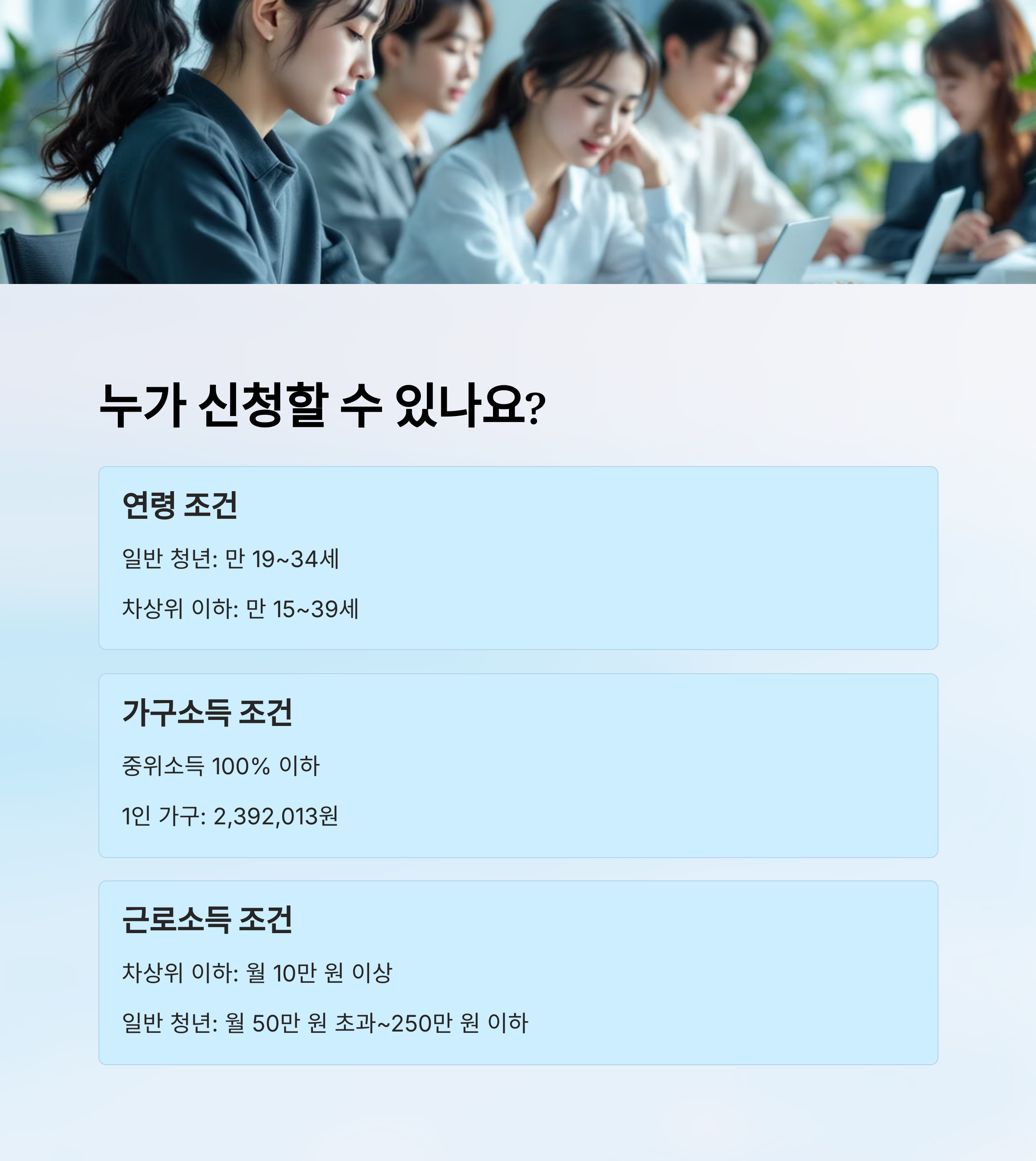 먼저, 가장 기본이 되는 자격은 '연령', '가구소득', '근로소득'이에요. 이 세 가지 조건이 모두 맞아야 참여할 수 있어요. 특히 소득과 나이 기준이 다소 복잡할 수 있기 때문에 하나씩 차근차근 설명해 드릴게요. 😊