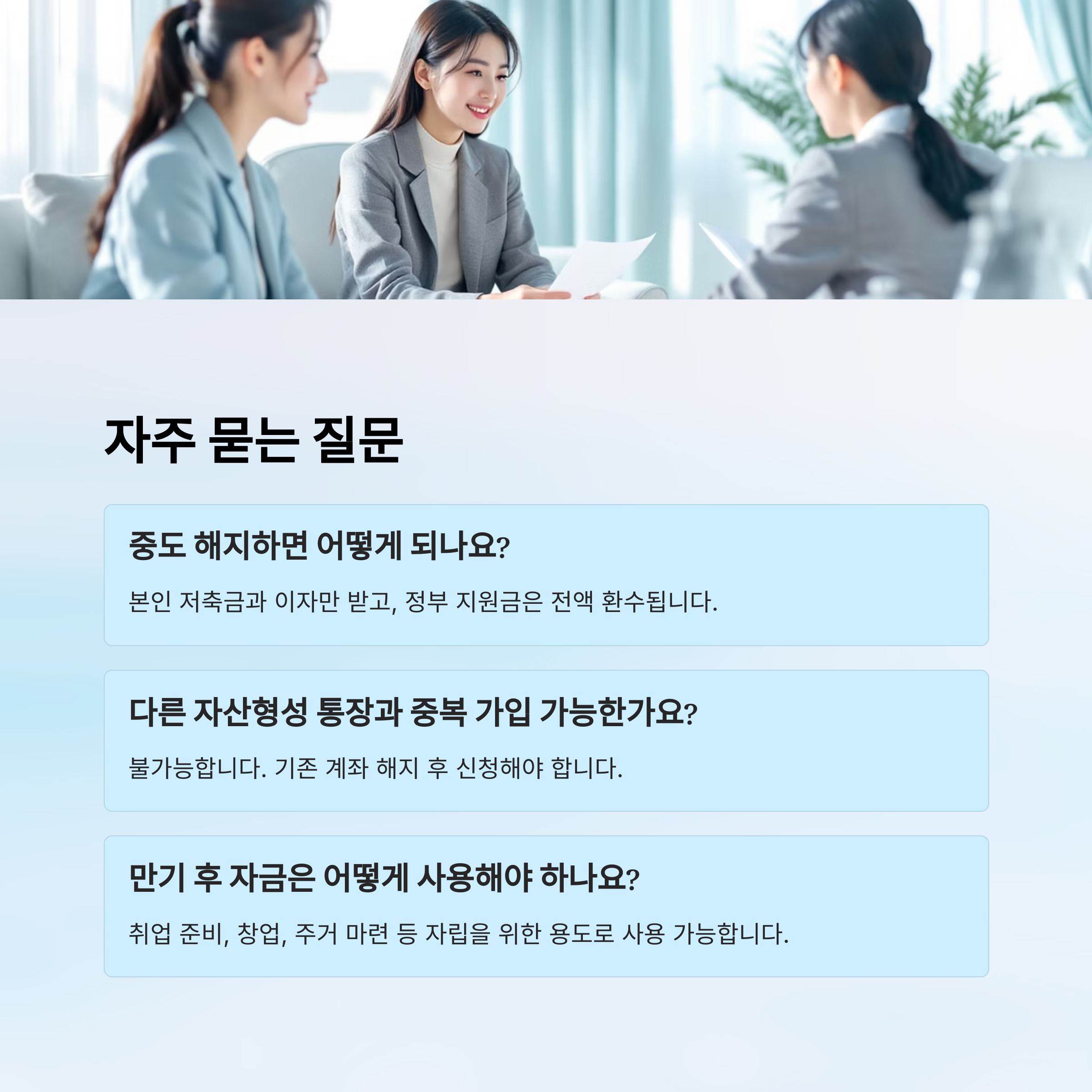 궁금한 점이 있다면 읍면동 행정복지센터나 자산형성지원콜센터(1522-3690), 자산형성포털 챗봇을 통해 문의해 보세요. 친절하게 도와줄 거예요! ☎️