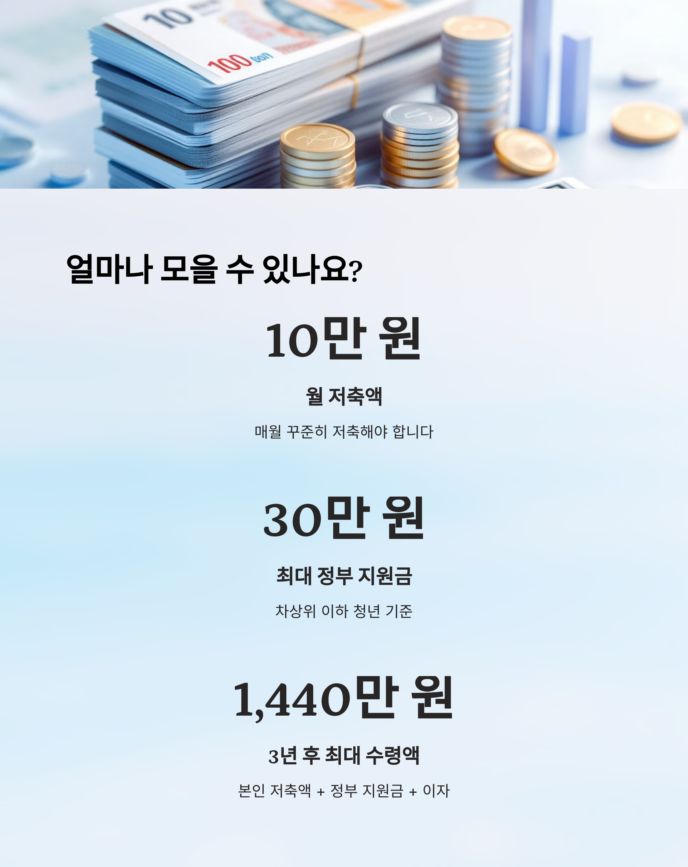 이 제도는 단순히 저축만 하는 것이 아니라, 정부가 추가로 최대 30만 원씩 지원해줘서 3년 뒤엔 최대 1,440만 원을 손에 쥘 수 있답니다. 저도 처음엔 "이게 진짜 가능한가?" 싶었는데요, 알고 보니 꽤 많은 청년들이 이미 이 제도를 통해 자산을 늘리고 있더라고요. 🙌