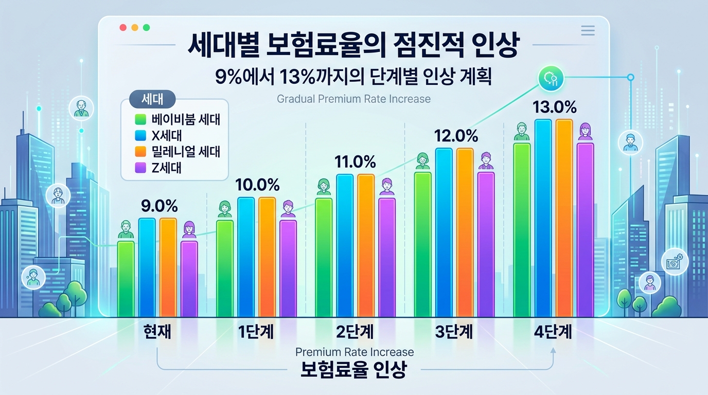 - 보험료율 인상: 2026년부터 9%에서 13%로 단계적 인상 시작