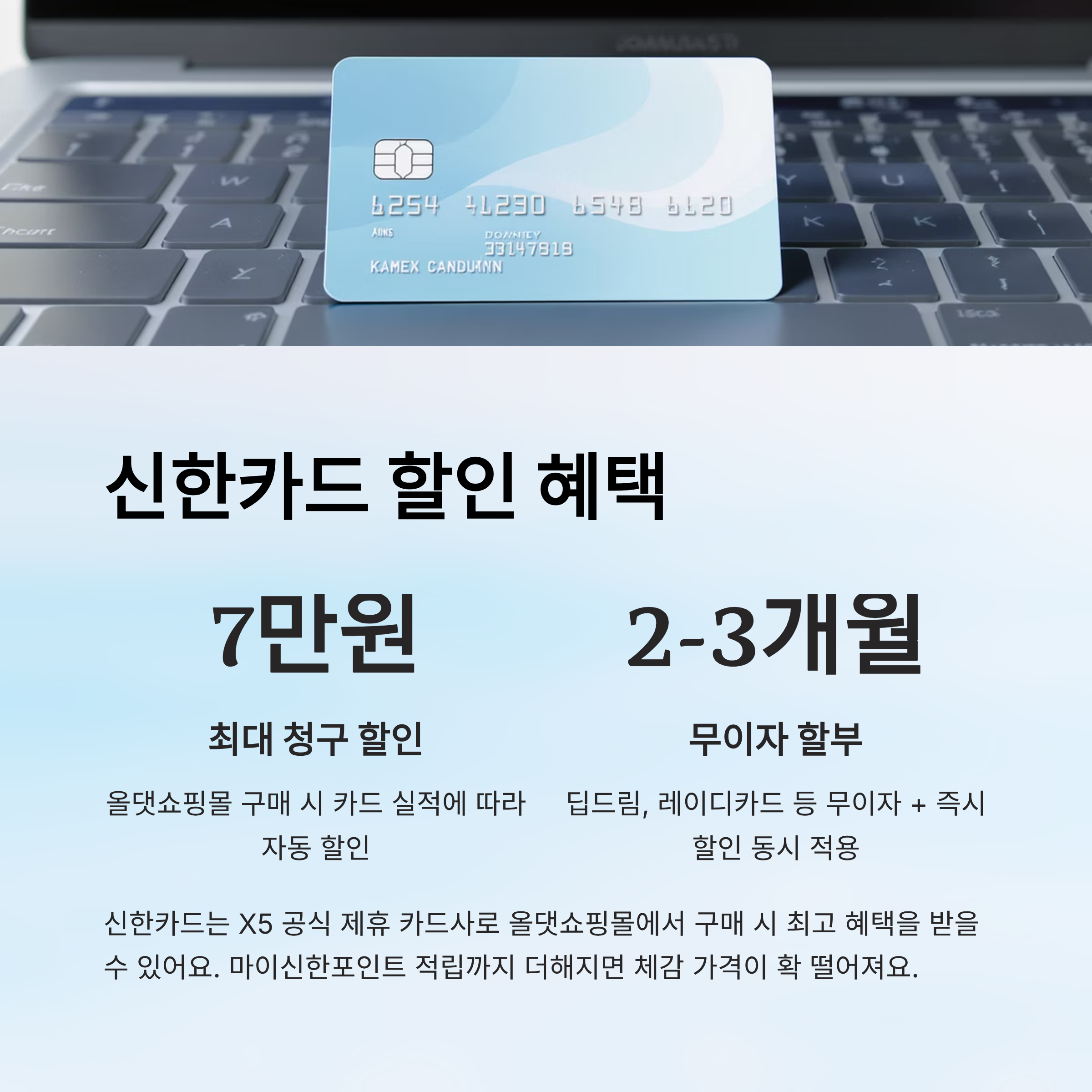 | 신한카드 | 최대 70,000원 | 2~3개월 | 마이신한포인트 | 공식 제휴, 올댓몰 구매 필수 |