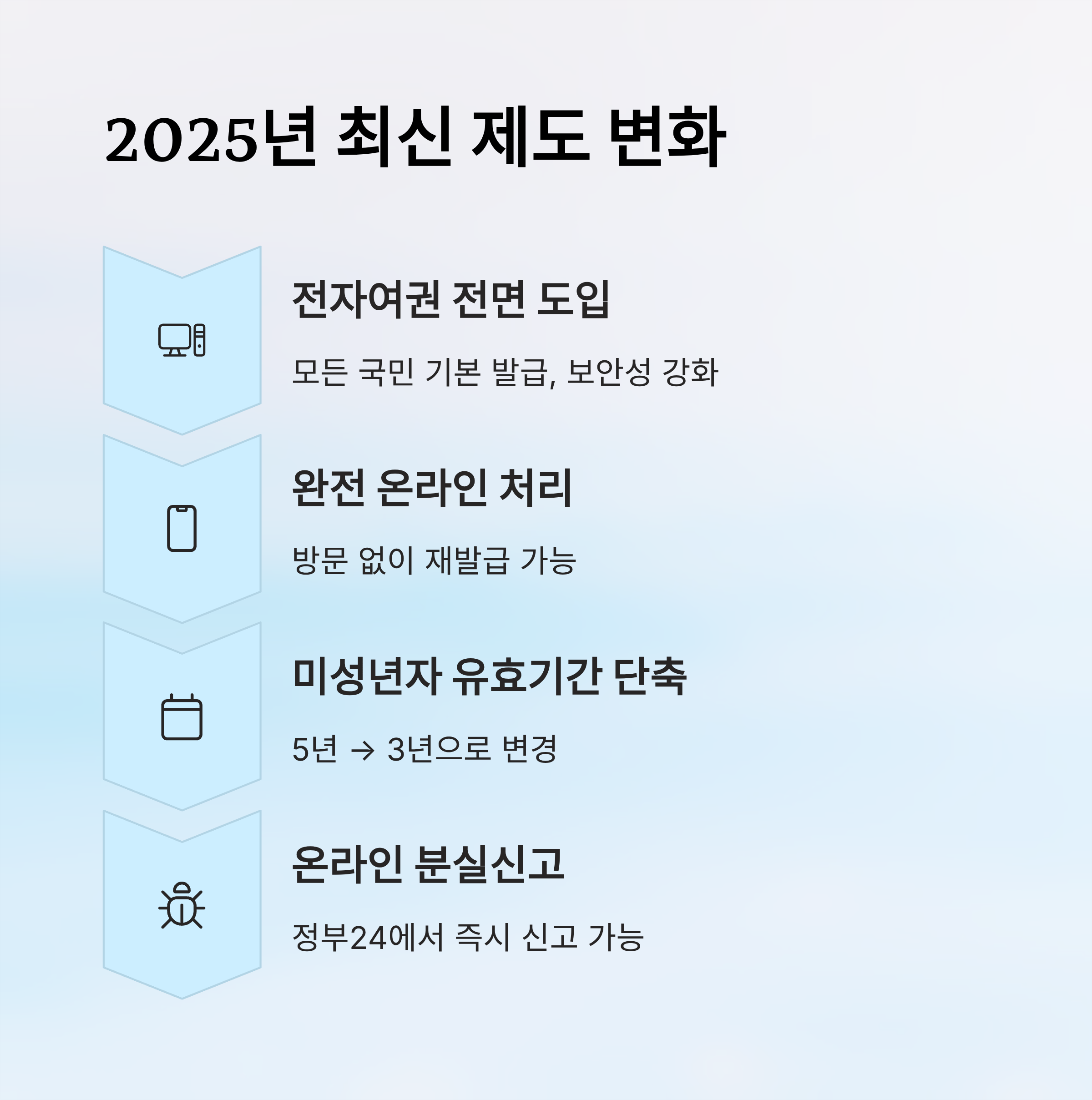 2025년에는 여권 제도가 조금 더 편리하게 개선되었어요. 가장 큰 변화는 전자여권 보급률 확대와 온라인 재발급 서비스의 강화예요. 과거에는 일부 인원만 전자여권을 발급받을 수 있었지만, 이제는 대부분의 국민이 기본적으로 전자여권을 발급받게 되었어요. 전자여권은 내장된 칩으로 인해 출입국 심사가 더 빨라지고 보안성이 높아져서 해외여행에서 유리하답니다. 🔐