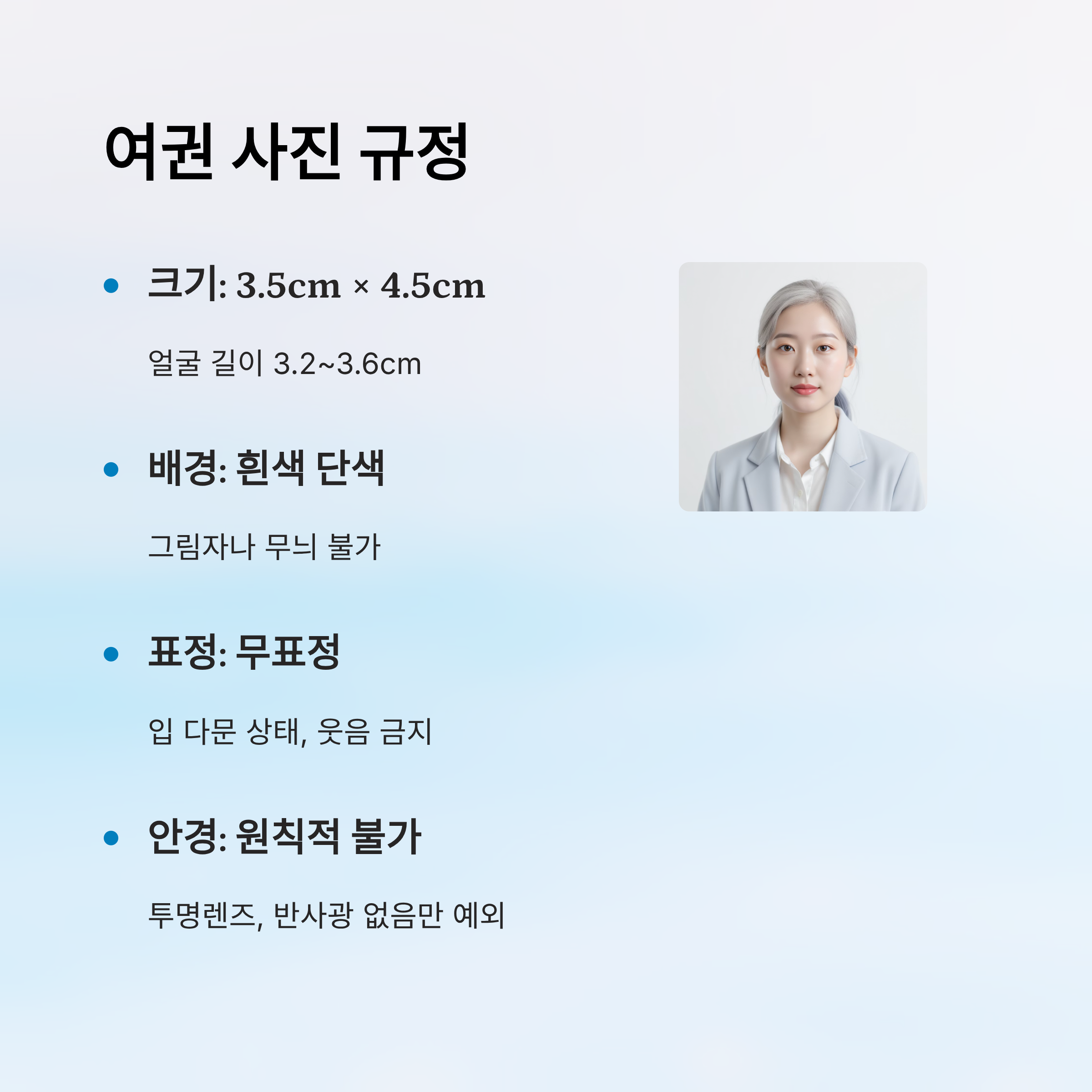 사진의 크기는 3.5cm x 4.5cm, 얼굴 길이는 3.2~3.6cm 범위 안에 들어와야 해요. 얼굴은 정면을 응시해야 하고, 미소를 짓거나 입을 벌리는 것도 안 돼요. 안경은 착용하지 않는 것이 원칙이지만, 시력 교정용으로 꼭 필요하다면 반사광이 없는 투명 렌즈 안경만 허용돼요.