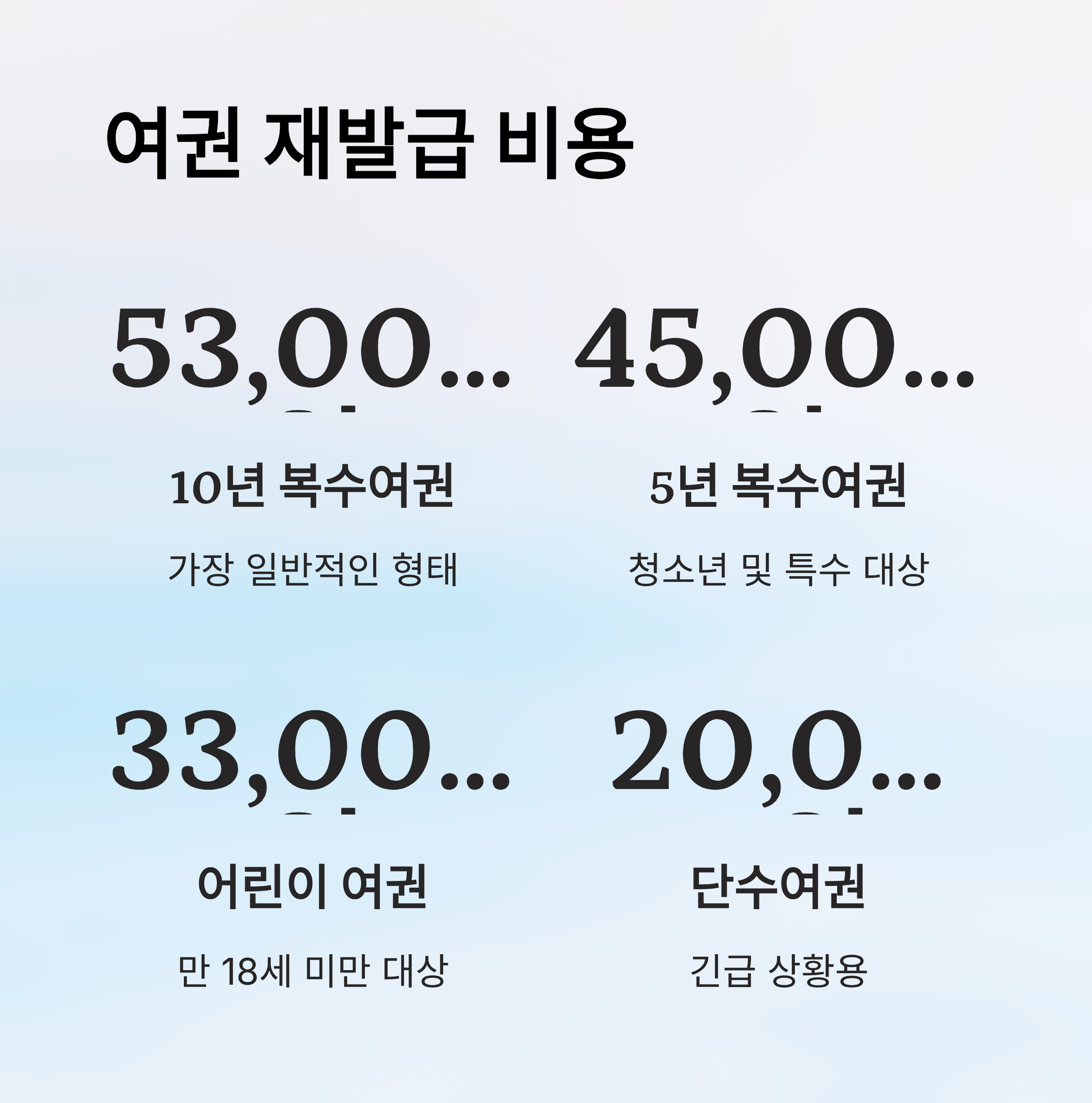 | 일반 복수여권 | 10년 | 53,000원 | 가장 일반적인 형태 |
