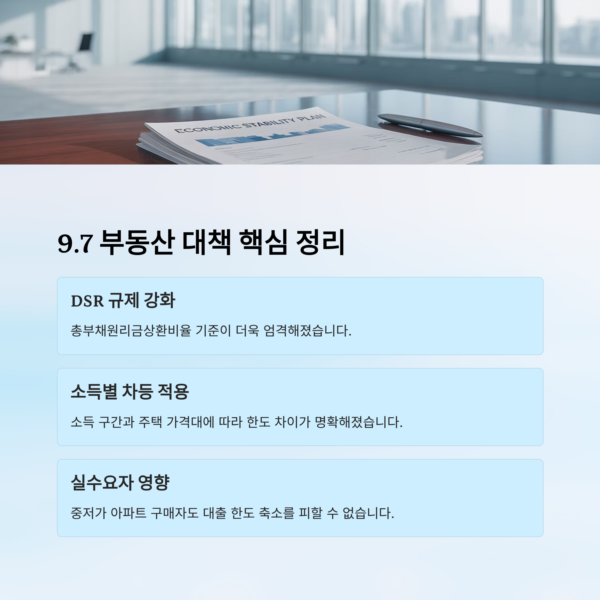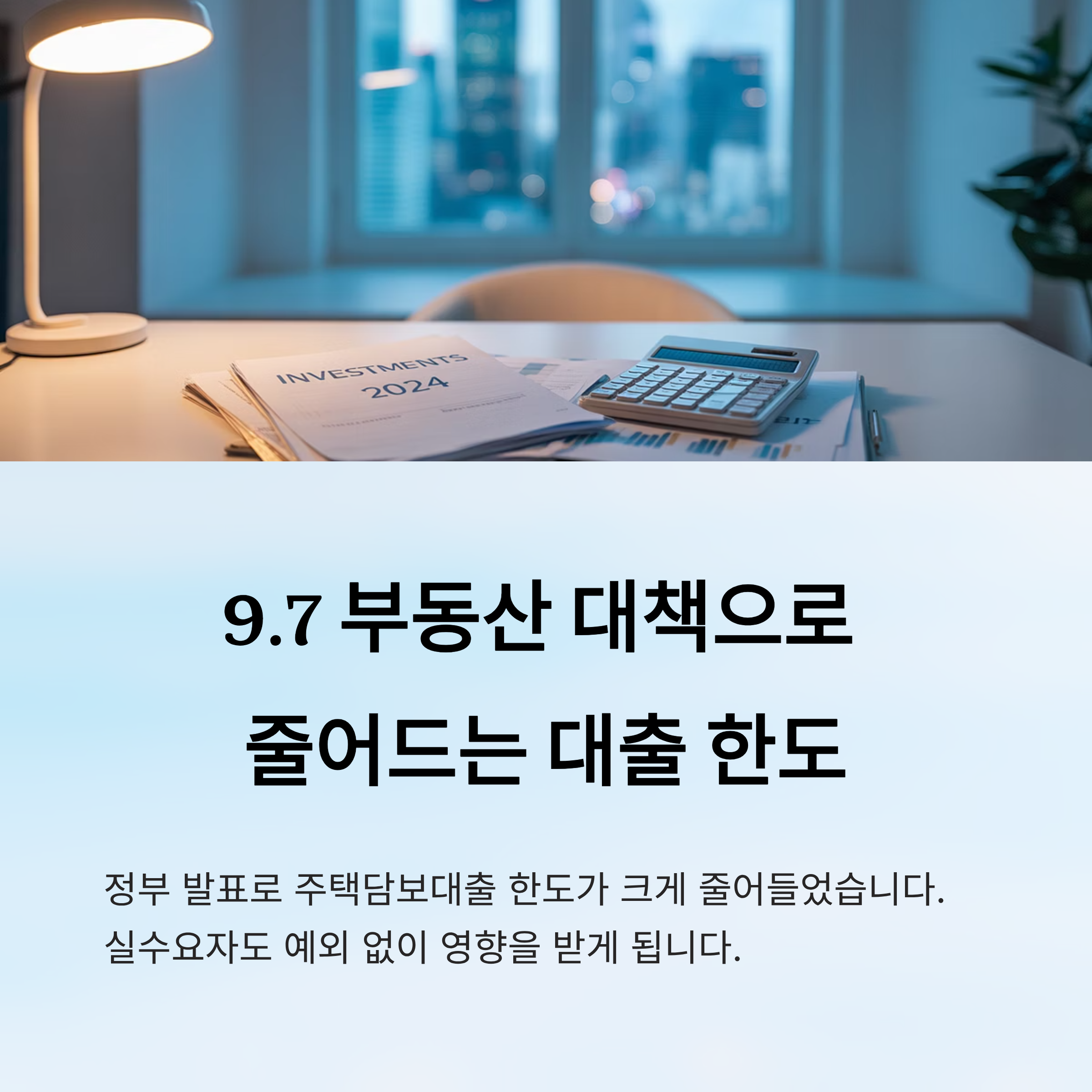 2025년 9월 7일 정부가 발표한 부동산 대책은 단순한 규제 강화를 넘어, 개인이 실제로 받을 수 있는 주택담보대출 한도를 크게 줄이는 내용이 포함되어 있어요. 이번 대책은 특히 중저가 아파트를 고려하는 실수요자들에게도 직접적으로 영향을 주기 때문에, 내 자금 계획을 다시 점검해야 할 필요가 생겼답니다.