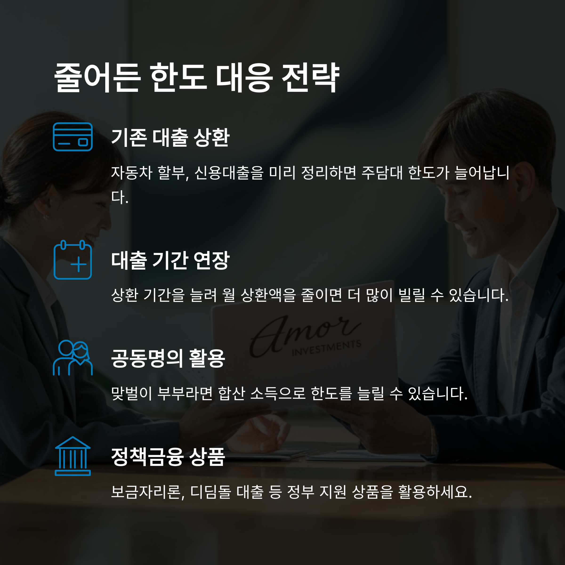 대출 한도가 줄어든 상황에서는 단순히 아쉬워하기보다, 어떻게 대응할지를 고민하는 게 훨씬 중요해요. 지금 같은 시기에는 금융 전략을 세밀하게 조정하지 않으면 원하는 주택을 구매하기가 어려워질 수 있답니다. 그렇다고 해서 무리하게 빚을 지는 건 더 위험해요.