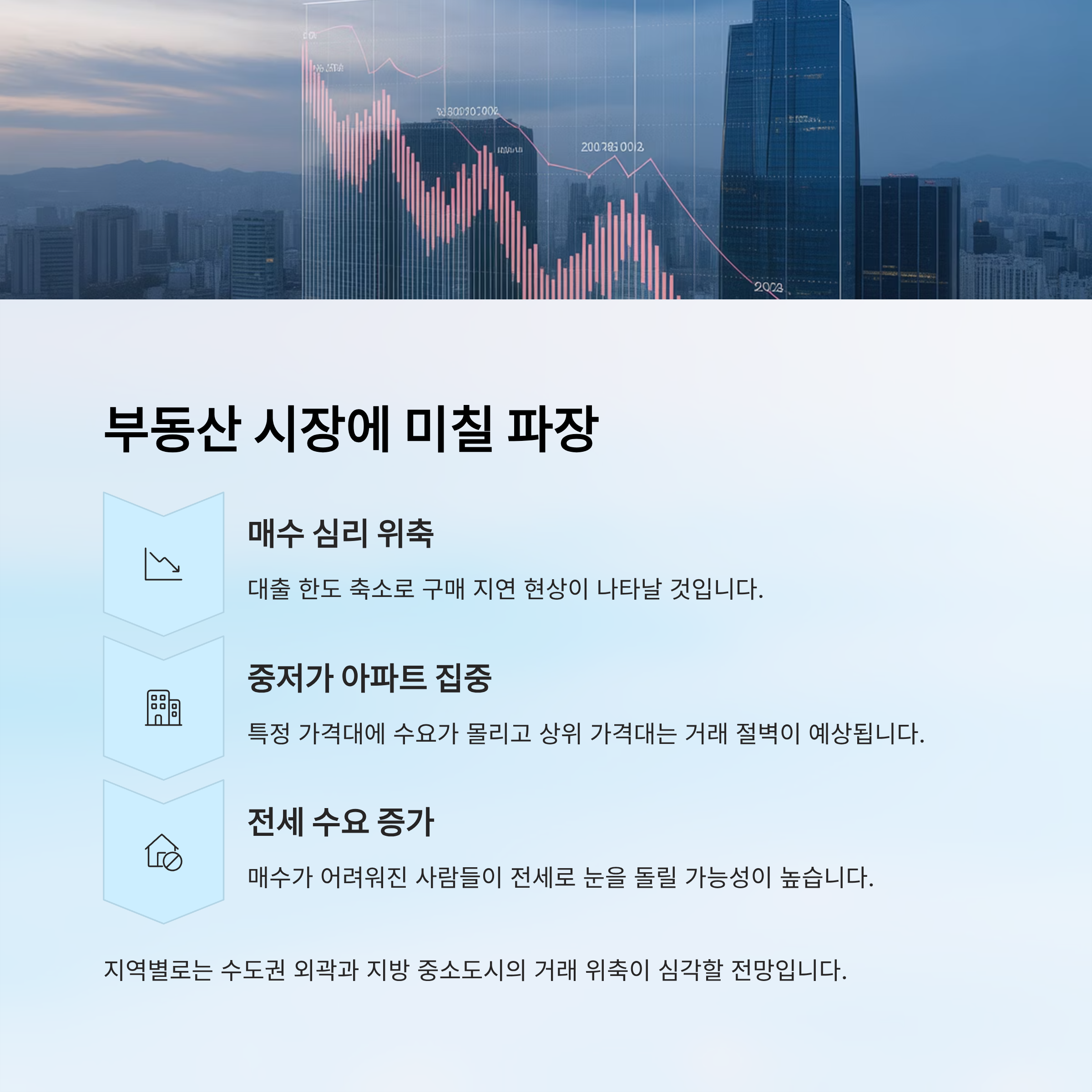 특히 중저가 아파트 시장은 영향을 더 크게 받을 수 있어요. 기존에는 대출을 활용해 3억~5억 원대 아파트를 구매할 수 있었던 실수요자들이, 한도 축소로 인해 2억~4억 원대 주택으로 눈높이를 낮추게 되거든요. 그 결과 특정 가격대에 매수세가 몰리고, 상위 가격대는 거래 절벽이 발생하는 구조가 될 수 있답니다.