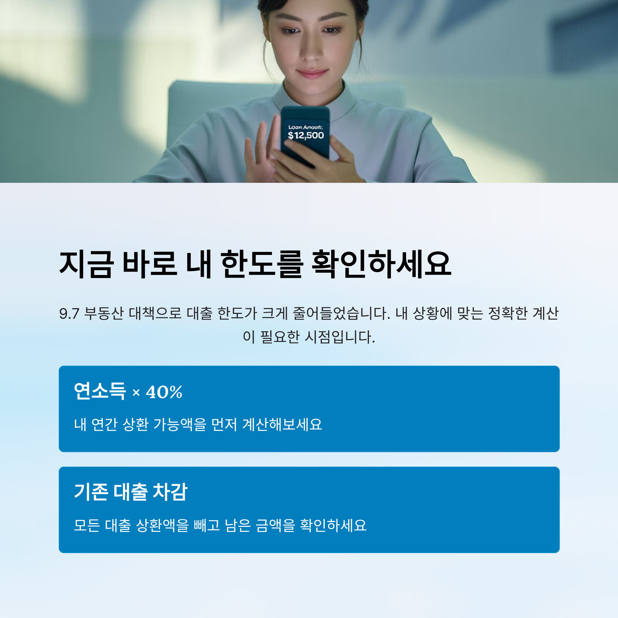실제로 은행 대출 상담을 받을 때도, 은행원은 이런 계산식을 기반으로 프로그램에 입력해서 한도를 알려줘요. 따라서 미리 내 대출 구조를 점검하고 가면, 예상과 크게 다른 금액이 나와 당황하는 일을 줄일 수 있어요. 특히 이번 9.7 대책 이후에는 이 차이가 더 커졌기 때문에 반드시 사전 점검이 필요하답니다.