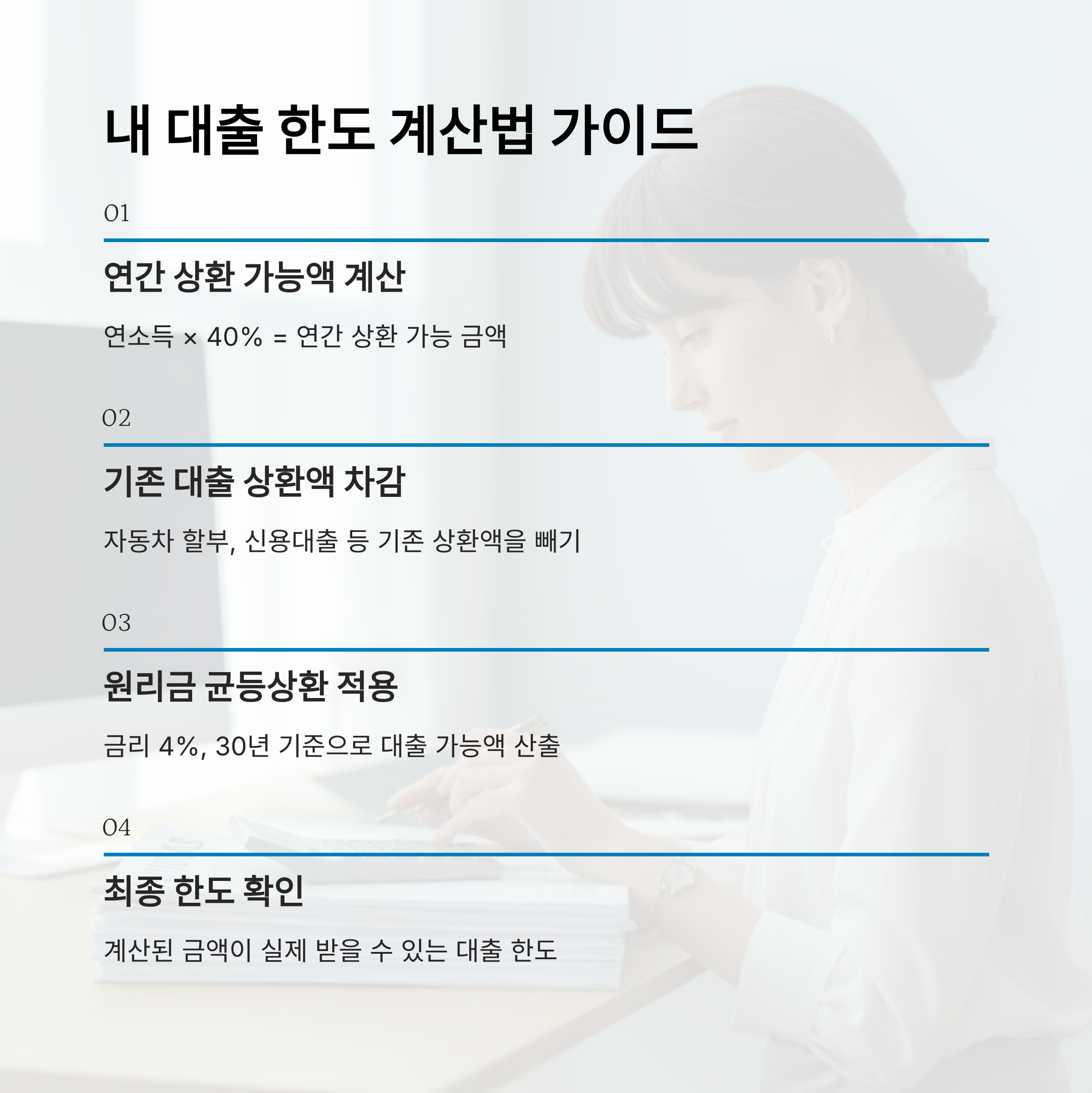 이제 이어지는 부분에서는 이런 변화를 바탕으로, 독자가 직접 자신의 대출 한도를 계산해볼 수 있는 구체적인 계산법을 알려드릴게요.