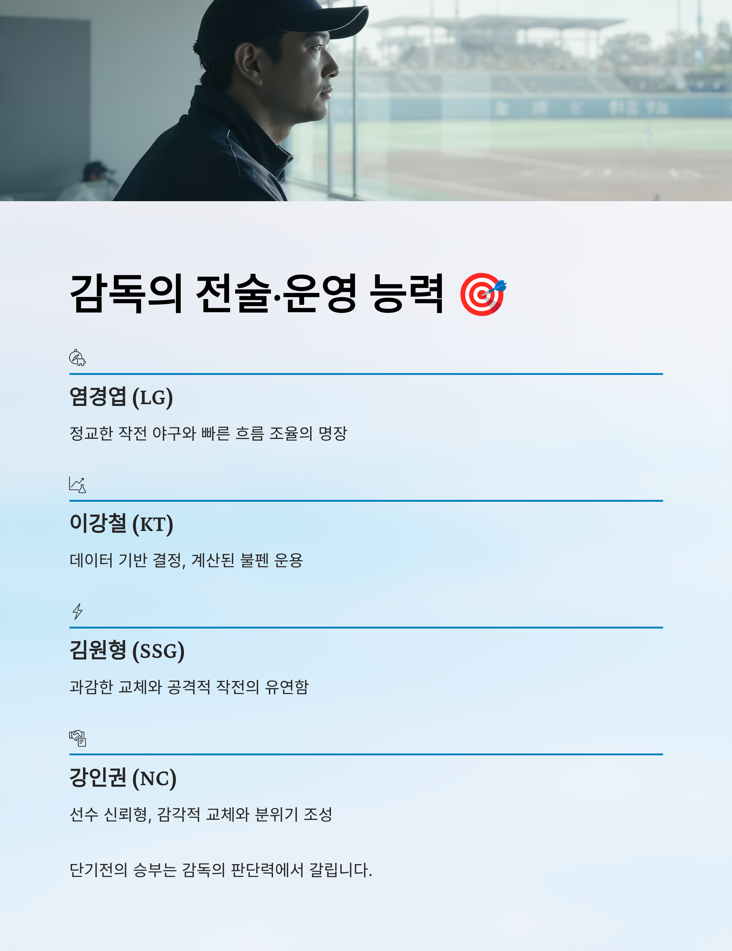 감독의 경험, 전술 성향, 심지어 성격까지도 가을 야구에선 변수로 작용해요. 올 시즌은 ‘감독들의 두뇌 싸움’도 관전 포인트예요. 🧠