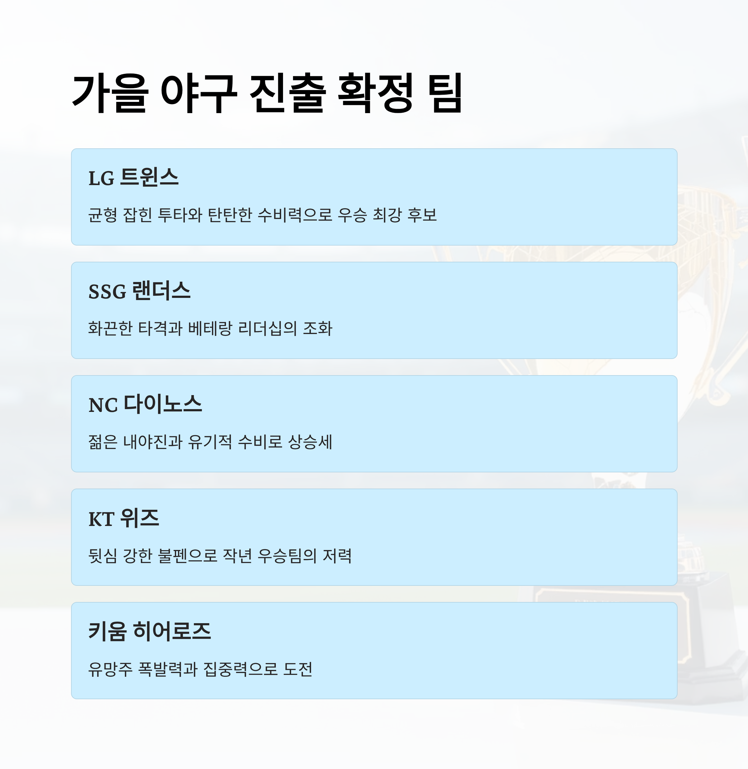 2025년 KBO 리그에서는 시즌 막판을 앞두고 포스트시즌 진출이 확정된 팀들이 윤곽을 드러냈어요. 대표적으로 LG 트윈스, SSG 랜더스, NC 다이노스, 키움 히어로즈, KT 위즈 등은 꾸준한 성적을 기반으로 상위권을 유지하며 가을 야구를 확정 지었죠. 이 팀들은 공통적으로 시즌 중반 이후 뚜렷한 상승세를 타면서 팀 밸런스를 조정하고, 핵심 전력에 맞춘 강화 작업을 적극적으로 펼쳤어요.