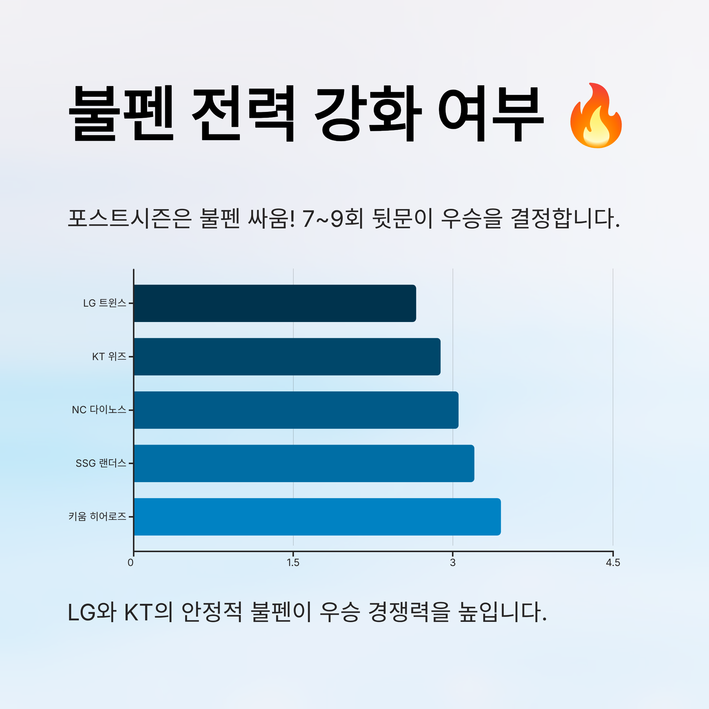 이 표만 봐도 우승 가능성이 높은 팀은 왜 불펜이 강한지 확실히 보이죠? 강팀은 '투수 총력전'이 가능한 구조를 갖추고 있다는 점이 느껴져요. 👏
