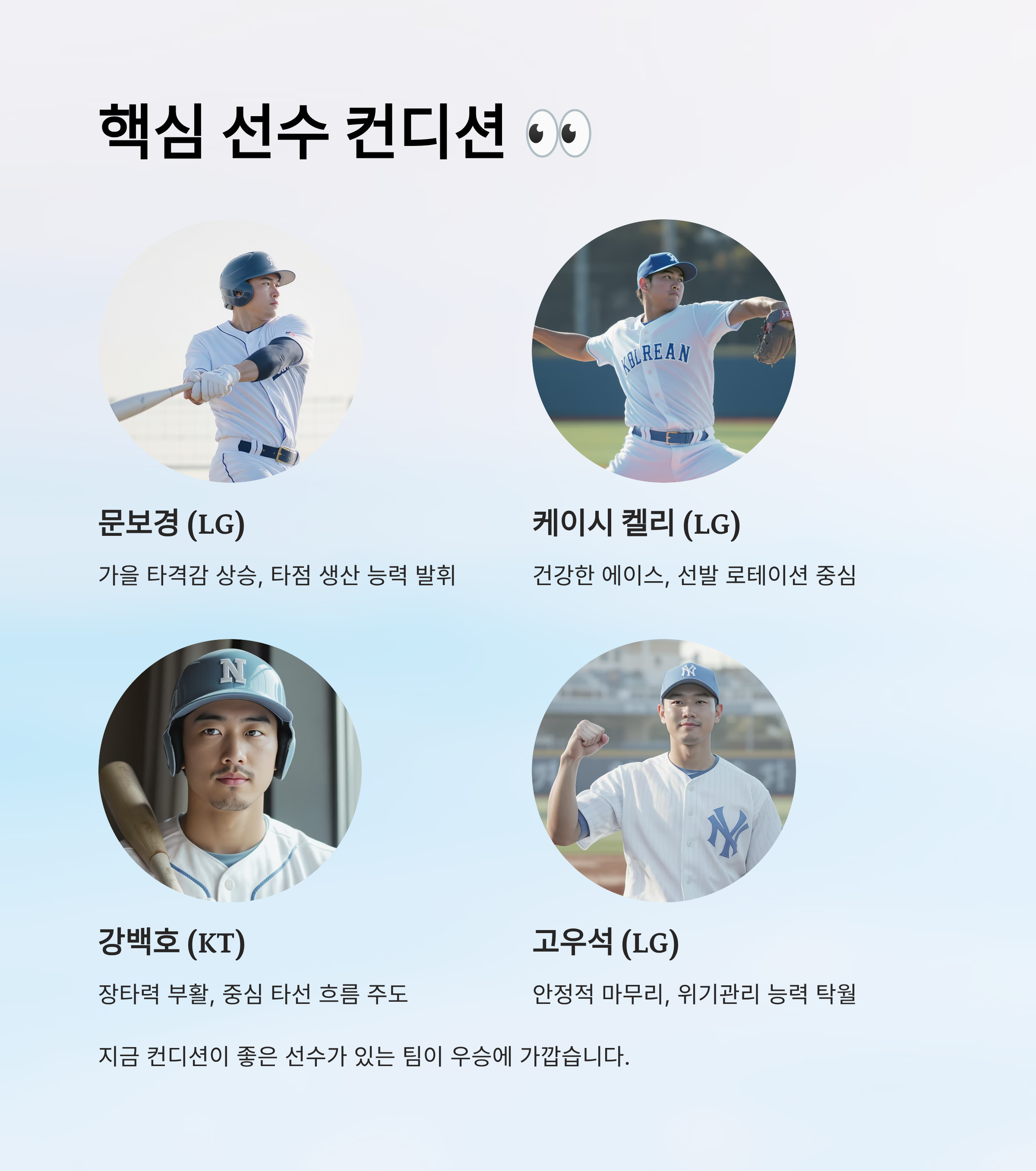 팀 전력 중에서도 ‘핵심 선수’들의 현재 컨디션은 승부의 분수령이 돼요. 특히 중심타자, 에이스 선발, 마무리 투수는 단기전에서 영향력이 막대하죠. LG의 문보경은 가을 들어 타격감이 물오르면서 타점 생산 능력을 톡톡히 발휘 중이고, 김현수 역시 큰 무대에서 베테랑다운 집중력을 보여주고 있어요.