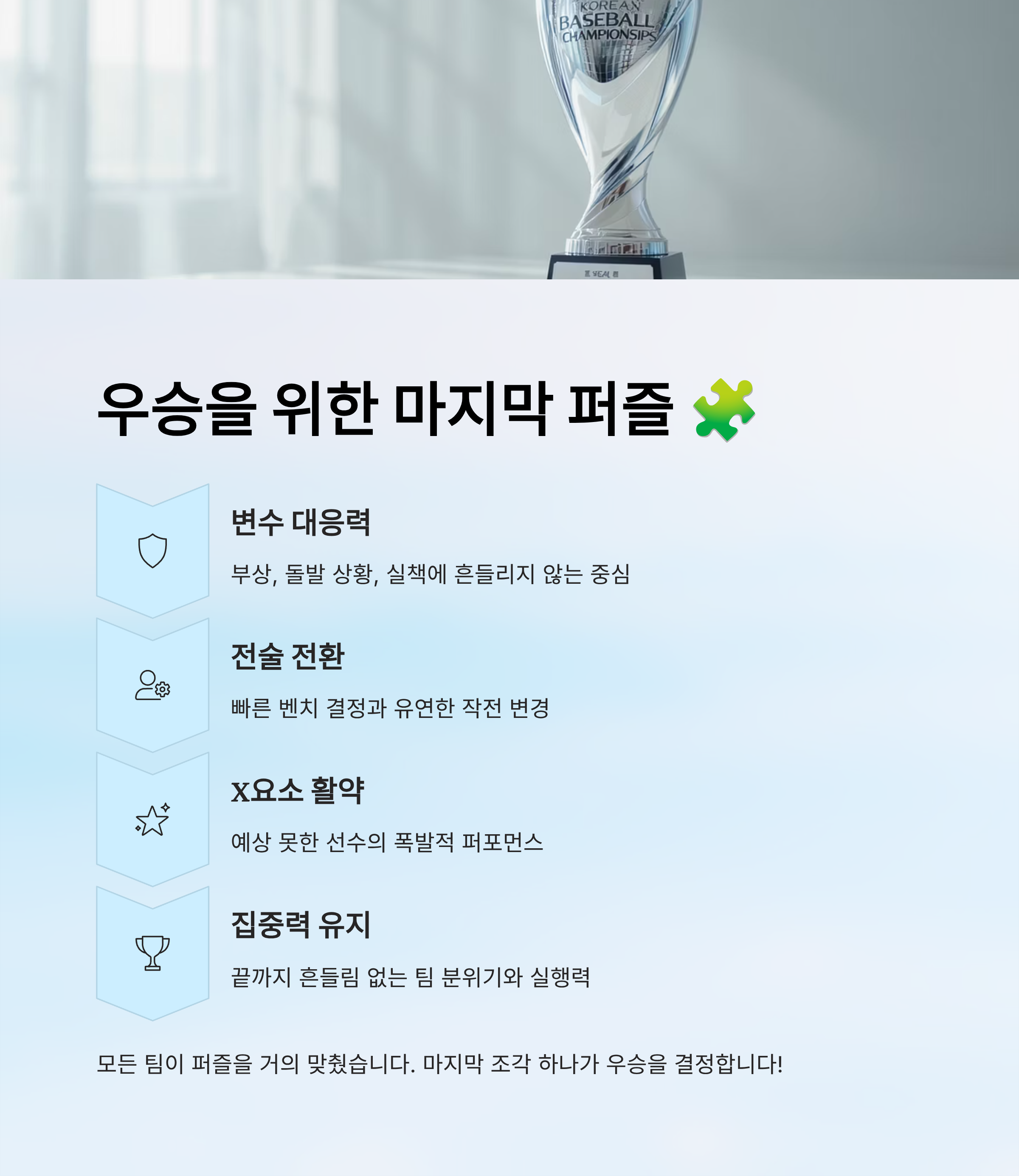 결국, ‘우승’을 위해선 평소 보이지 않던 변수를 극복할 수 있는 시스템, 즉 대응 매뉴얼이 있는 팀이 강해요. 투수 교체에 망설임이 없고, 타순 변화에 유연하며, 예상 못한 활약을 하는 ‘X요소’가 나올 수 있는 팀이 최종 승자가 되는 거죠.